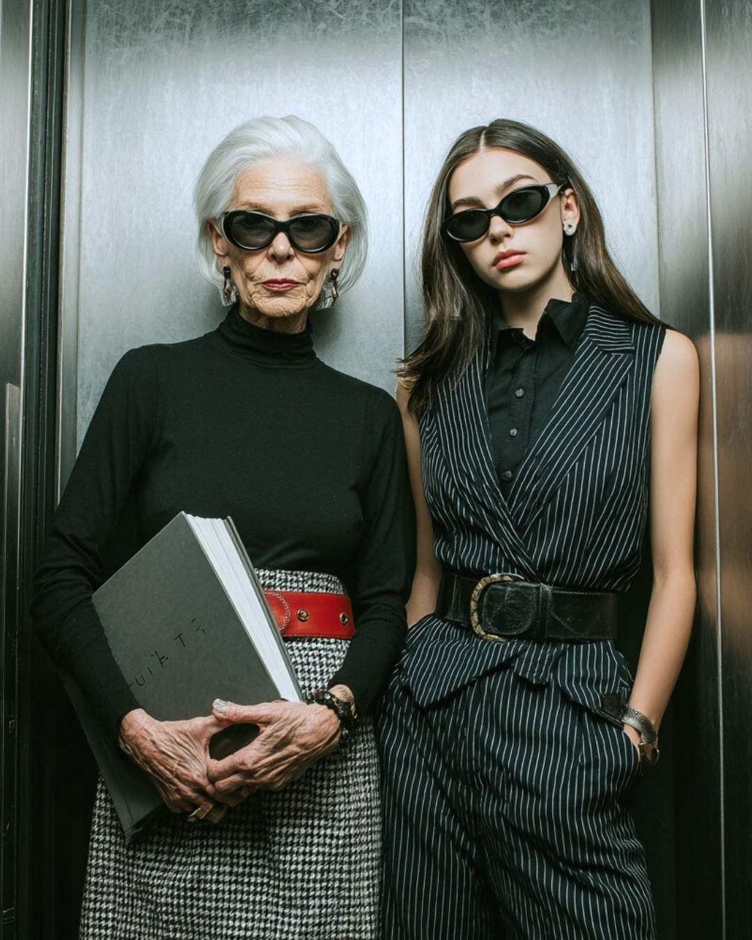 Prompt: High-fashion editorial portrait of two stylish women standing side by side inside a metallic elevator, one elderly with a sharp white bob haircut wearing a fitted black turtleneck, statement earrings, dark cat-eye sunglasses, and a red belt over a houndstooth skirt while holding a large black portfolio, the other a younger brunette wearing narrow black sunglasses and a tailored black pinstripe sleeveless suit with a wide belt, hands in pockets, both posing with calm confident expressions, luxury fashion magazine aesthetic, cinematic lighting, cool tones, sleek urban power dressing, minimalist background, ultra-detailed skin and fabric texture, polished editorial photography, full-body composition, sharp focus, realistic, high contrast, Vogue-style, 85mm lens, shallow depth of field |