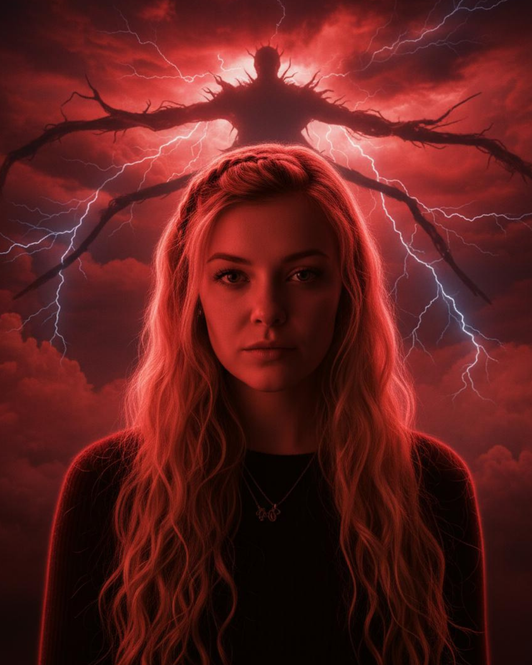 Prompt: A cinematic, hyper-realistic Stranger Things–style portrait of this person centered in frame, lit by eerie red light that wraps around their face and shoulders with a serious, tense expression. Behind them, a dark foggy red sky filled with lightning and swirling mist reveals the faint silhouette of a massive, otherworldly creature with very very long tendril-like limbs stretching through the clouds—its form ghostly and half-hidden by the haze. The atmosphere should feel heavy, moody, and cinematic with deep contrast, seamless lighting, and no text or logos, in 4K resolution. |